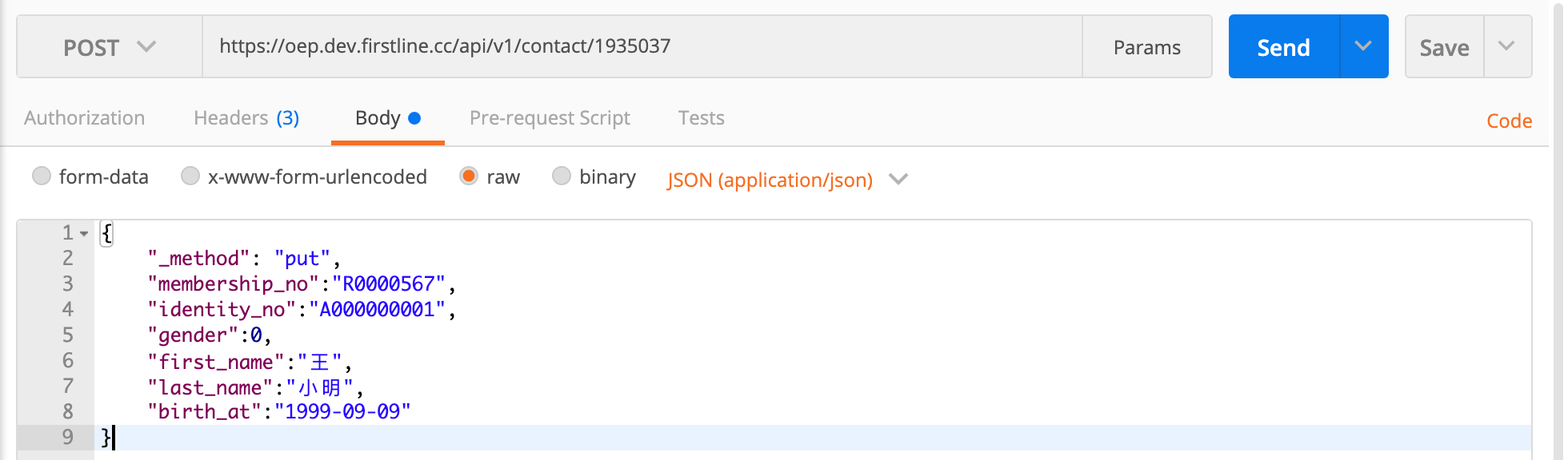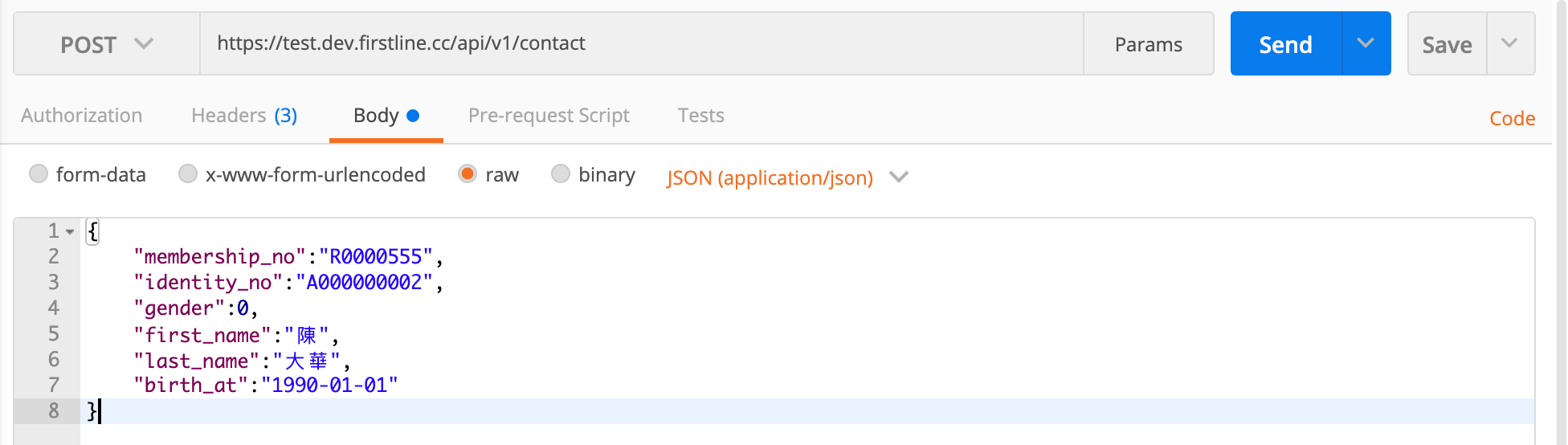 }In Postman, it is recommended to select Body -> raw and enter JSON directly. This avoids Postman mistakenly converting numeric values to strings, which can cause some fields to fail validation.